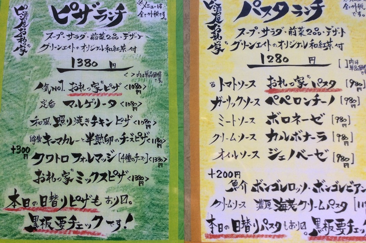 2018/05/14ピ酒屋「おれっ家」のランチは主に、ピザ・パスタのいずれかを選んでいただきランチセットにするか否かを自身で決めてもらう形となっております。 ランチセットにして頂くと前菜4種、食後のデザート、グリーンエイトの和紅茶飲み放題がついてきますので、こちらの方が断然お得です。 きっと満足して頂けると思いますので、ボリューム満点のピ酒屋ランチ御来店お待ちしております。 -