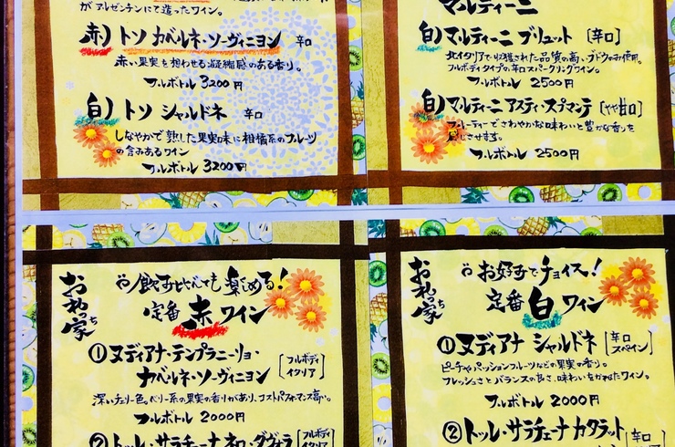 2018/05/15ピ酒屋「おれっ家」お酒のメニューを紹介させていただきます。 当店、ワインは「俺家ワイン」を筆頭に、ボトル赤ワイン5種・ボトル白ワイン4種、スパークリング赤2種・白2種、その他グラスワイン赤・白があります。 その他にも、ビール・ビアカクテル・カクテル・ウィスキー・チューハイ・あらごしシリーズ・ノンアルコールビール、カクテル・焼酎・梅酒日本酒などがご用意しております。 御来店お待ちしてます。 ... -